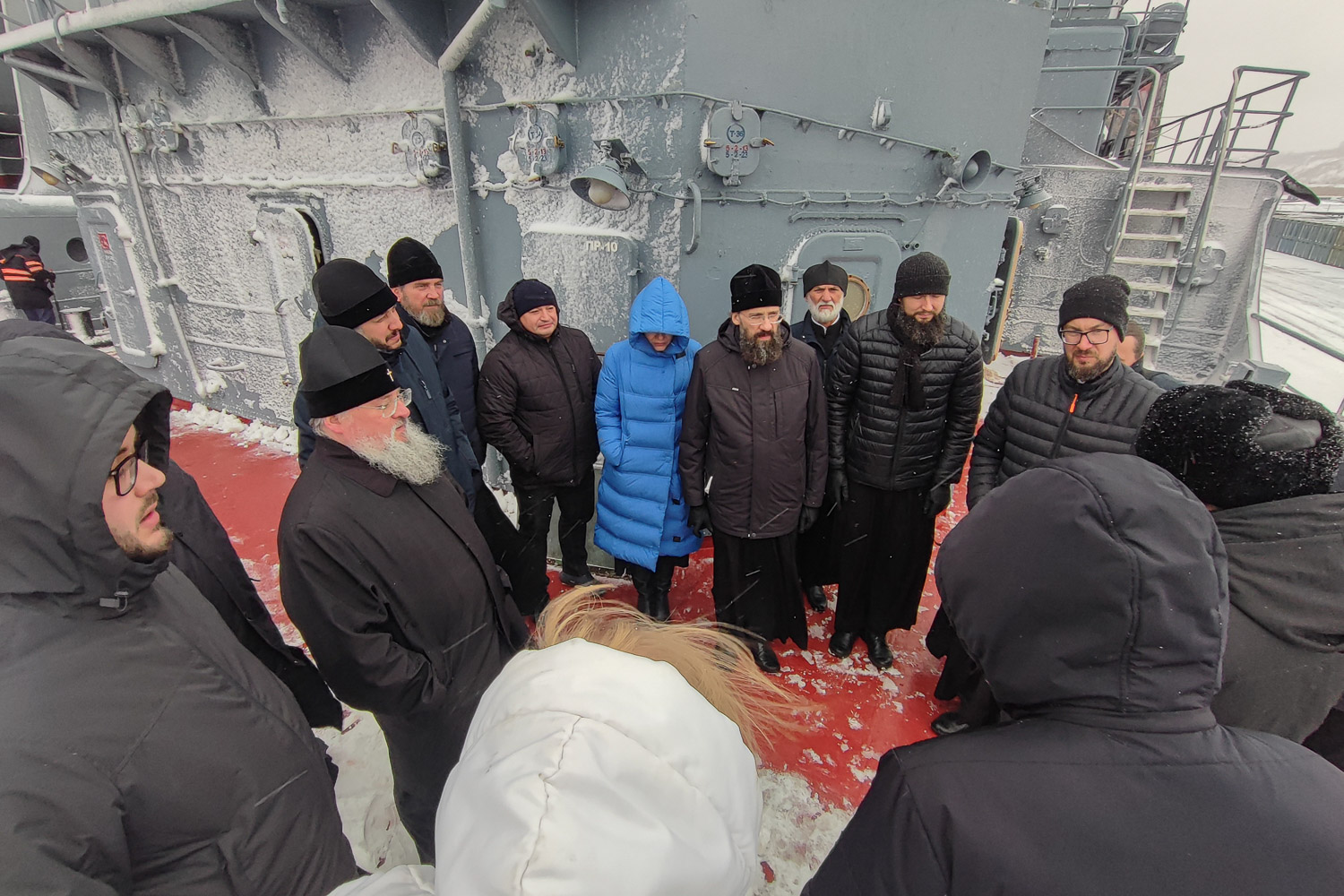 Затем архиереи Красноярской митрополии посетили боевые корабли Северного флота: большой противолодочный корабль «Североморск» и большой десантный корабль «Александр Отраковский». Отряд боевых кораблей Северного флота прибыл в порт Дудинка из порта Диксон по реке Енисей. Ранее отряд выполнял задачи в Баренцевом, Норвежском и Карском морях. Во время пребывания кораблей в порту Дудинки проводятся патриотические мероприятия в память о 80-й годовщине Победы в Великой Отечественной войне. Архиереи посетили выставку в рамках акции «Сила в правде», которая организована на корабле «Александр Отраковский».