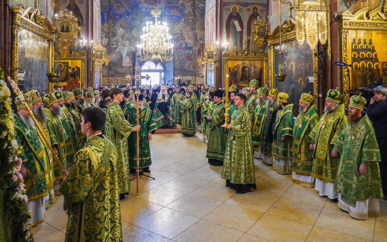 Перед началом богослужения у входа в Успенский собор Предстоятеля Русской Православной Церкви встречали: наместник Свято-Троицкой Сергиевой лавры, ректор Московской духовной академии епископ Сергиево-Посадский и Дмитровский Кирилл; насельник Троице-Сергиевой лавры архимандрит Макарий (Веретенников); секретарь Патриарха Московского и всея Руси по г. Москве протопресвитер Владимир Диваков; глава Сергиево-Посадского городского округа Московской области О.В. Ероханова.