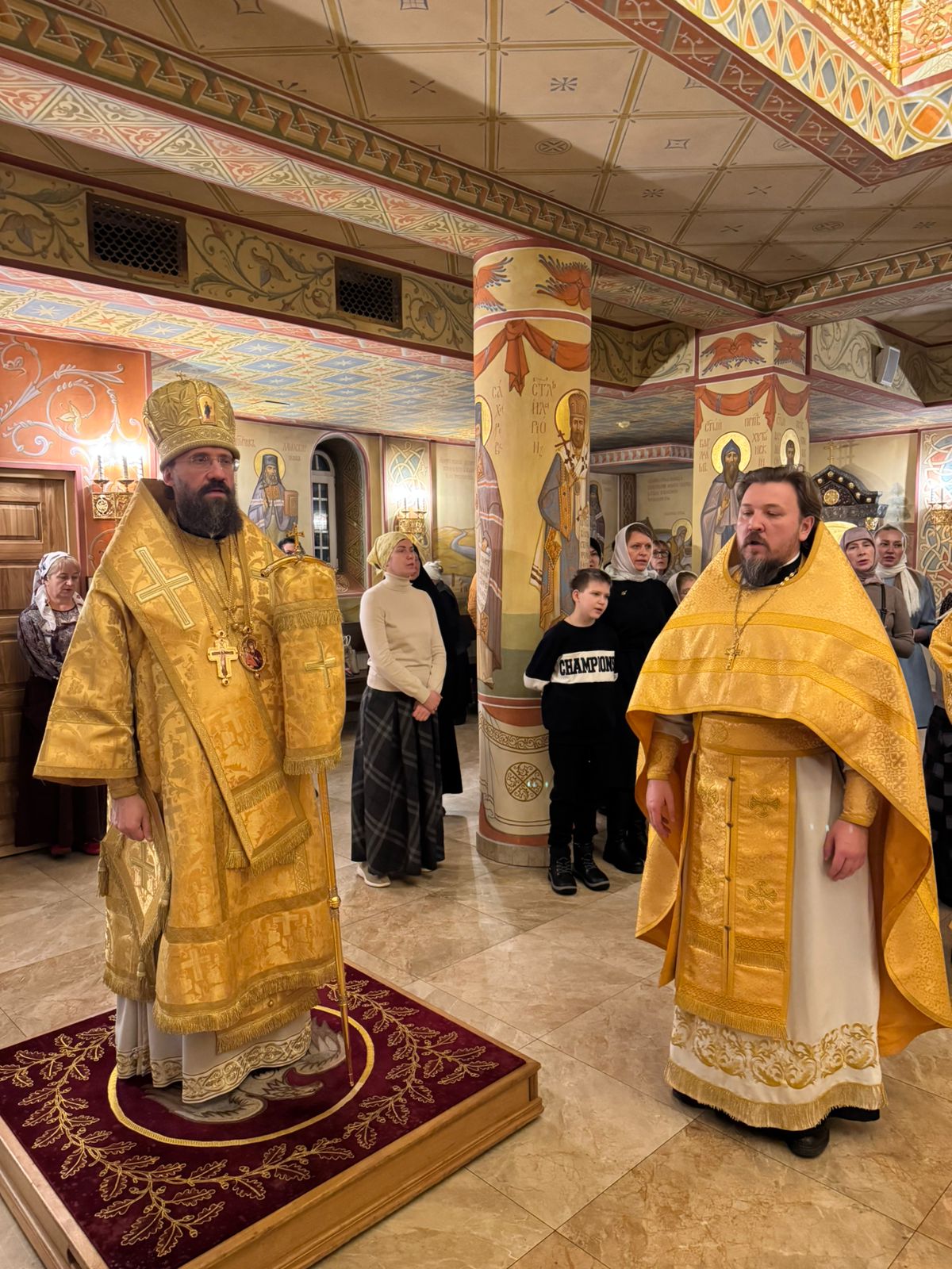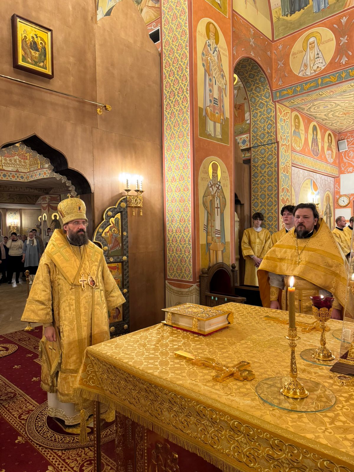 Его Преосвященству сослужили благочинный Норильского округа, настоятель храма новомучеников и исповедников Церкви Русской г. Норильска иерей Геннадий Дубинко и клирик Красноярской епархии, благочинный по тюремному служению Красноярской епархии, помощник начальника ГУФСИН по Красноярскому краю по организации работы с верующими иерей Родион Петриков.
