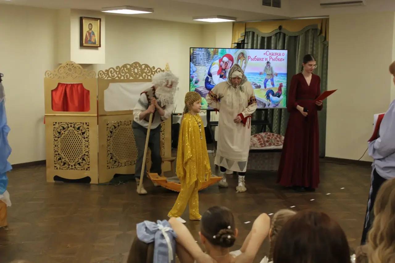 Воспитанники воскресной школы, родители и прихожане-участники «Воскресной беседки» исполнили песни и стихи, посвященные празднику Воскресения Христова и представили театральную зарисовку «Сказка о рыбаке и рыбке».