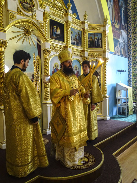 Его Преосвященству сослужили секретарь Норильской епархии иеромонах Герман (Мельников) и духовенство кафедрального собора города Норильска.