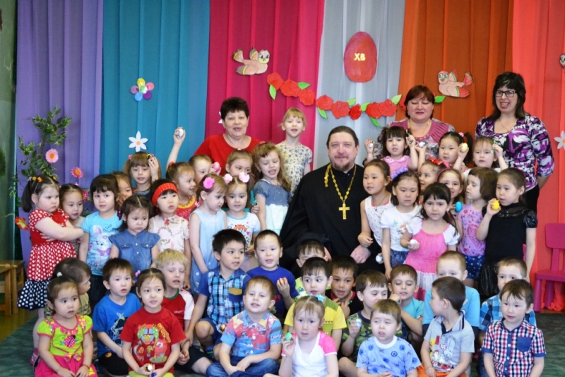 15 апреля 2015 года в Среду Светлой Седмицы в селе Хатанга в детском саду «Солнышко» прошел Пасхальный утренник для воспитанников детского сада. На праздник посвященный Светлому Христову Воскресению был приглашен настоятель Свято-Богоявленского храма иеромонах Евфимий.