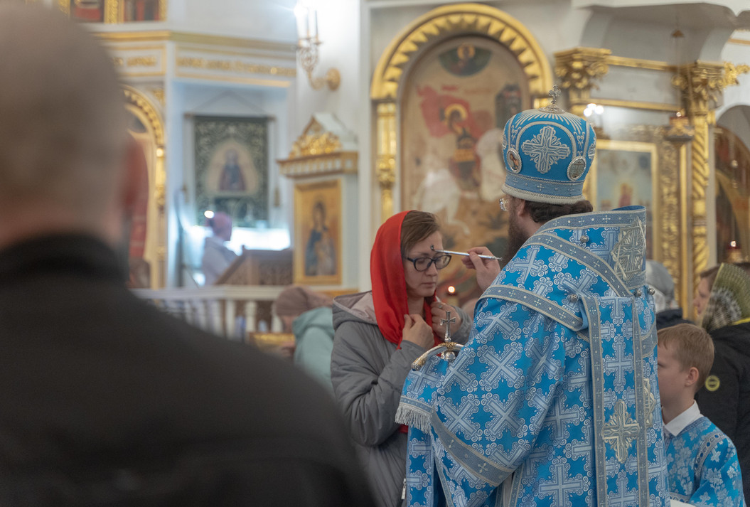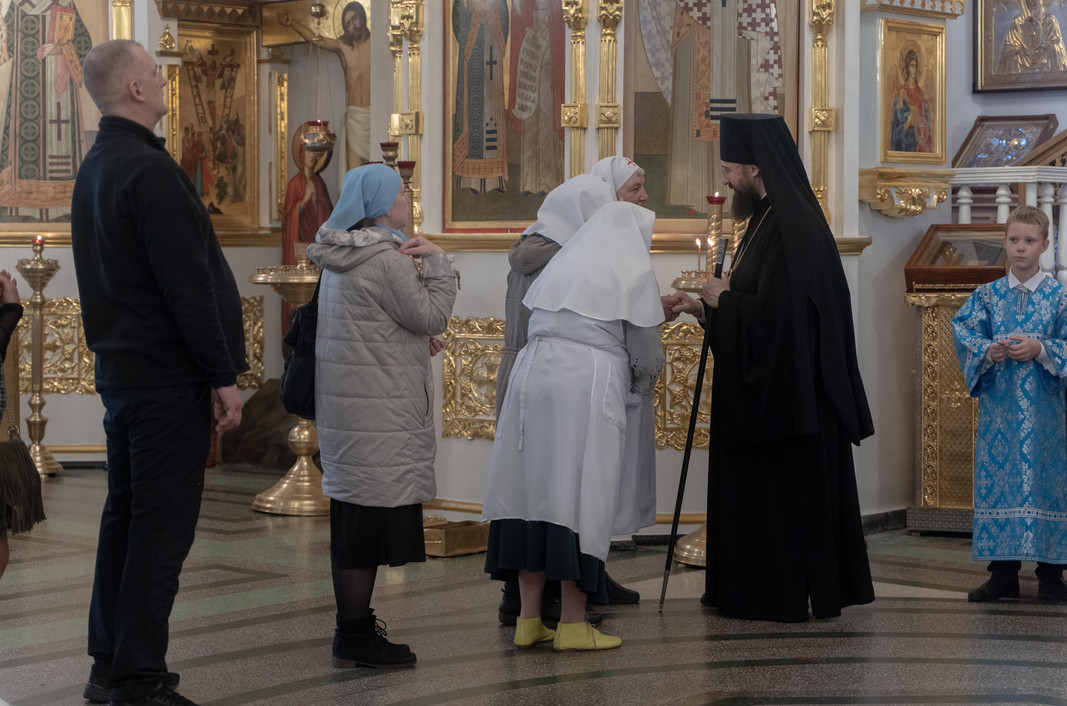 После Великого славословия священнослужители, взяв Плащаницу, под пение заупокойного «Святый Боже…» обнесли её вокруг храма. По окончании крестного хода Владыка Агафангел помазал верующих освященным елеем.