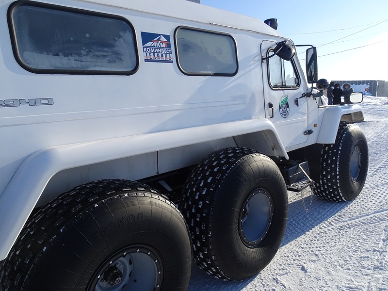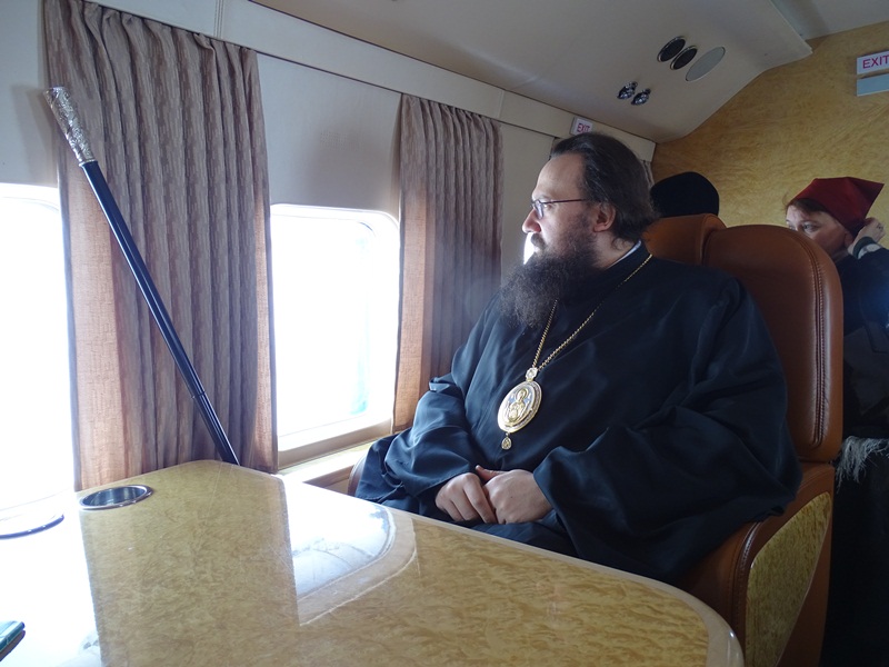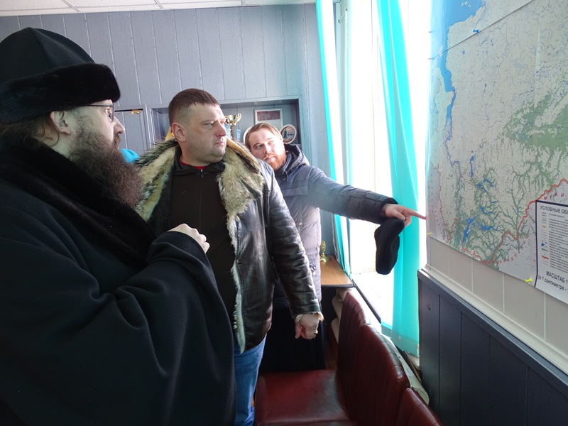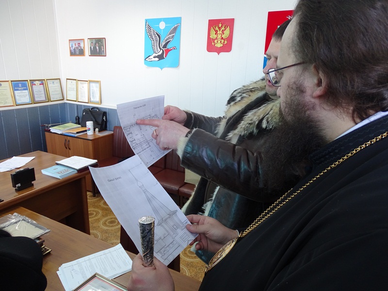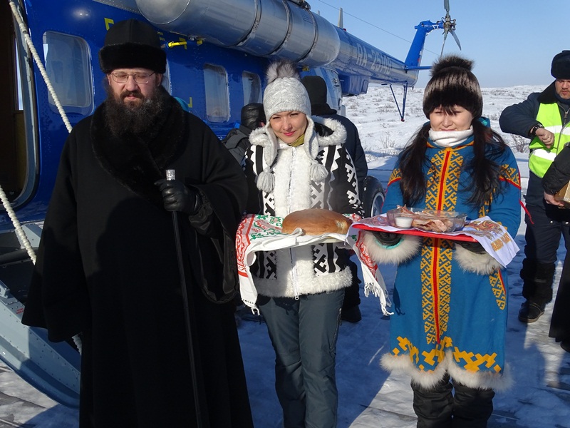 На вертолетной площадке гостей встретил глава муниципального образования «Сельское поселение Караул» Дмитрий Владимирович Рудник. Девочки в национальной одежде встретили Владыку не только русским караваем, но и подносом со свежеструганной рабой – хлебом Таймыра. Затем все в специальных вездеходах поехали к зданию администрации, где состоялась рабочая встреча, посвященное главному делу, ради которого приехала столь представительная делегация.