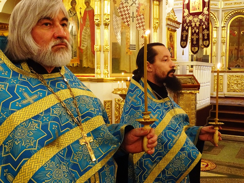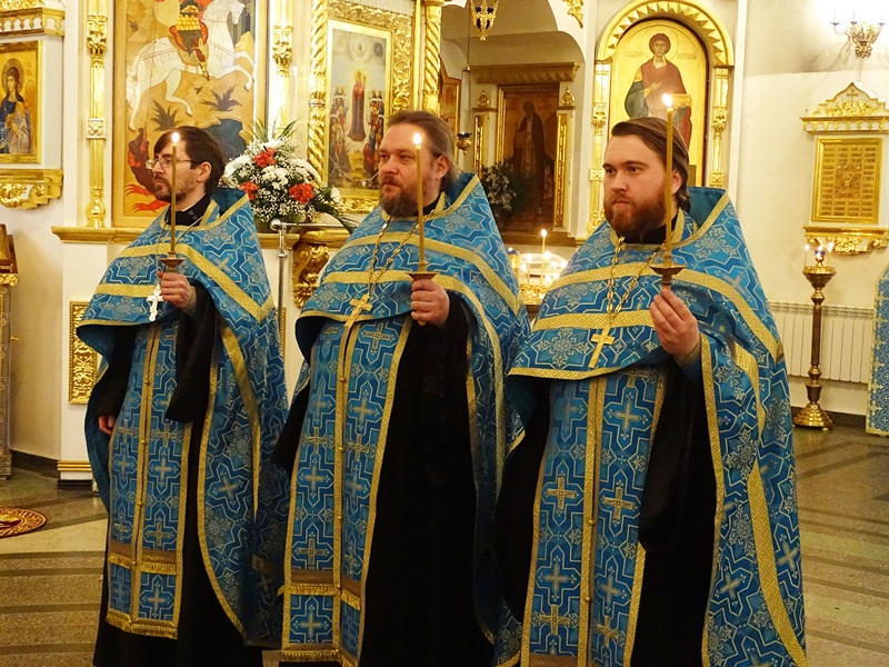 Его Преосвященству сослужили: секретарь Норильской епархии иеромонах Герман (Мельников); благочинный Норильского округа протоиерей Владимир Иванов; штатный клир собора.