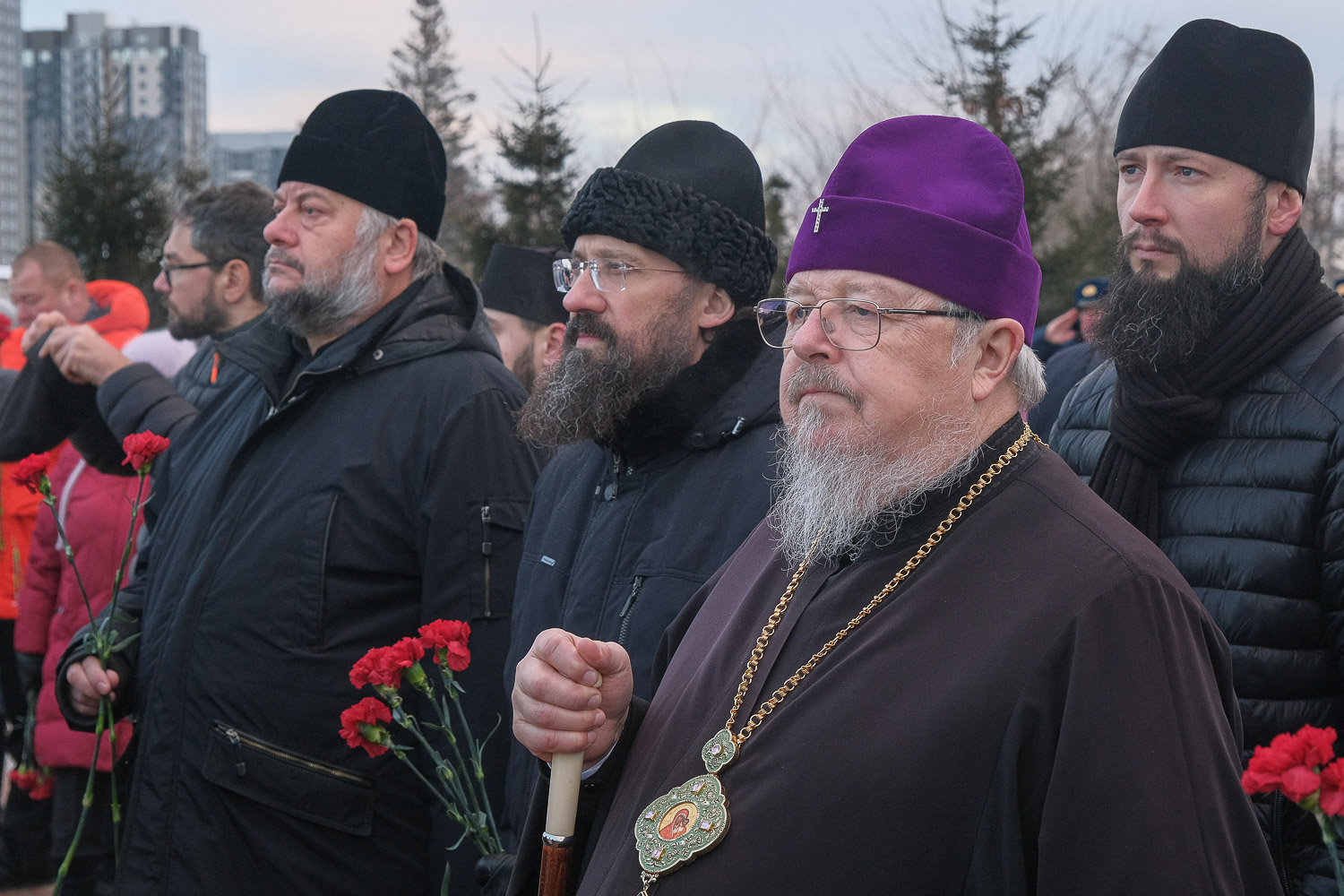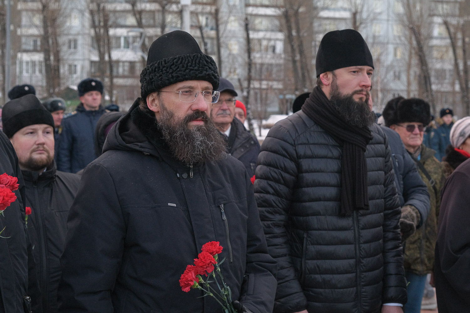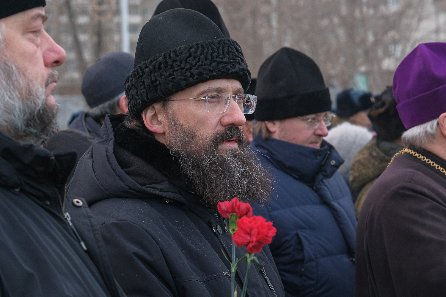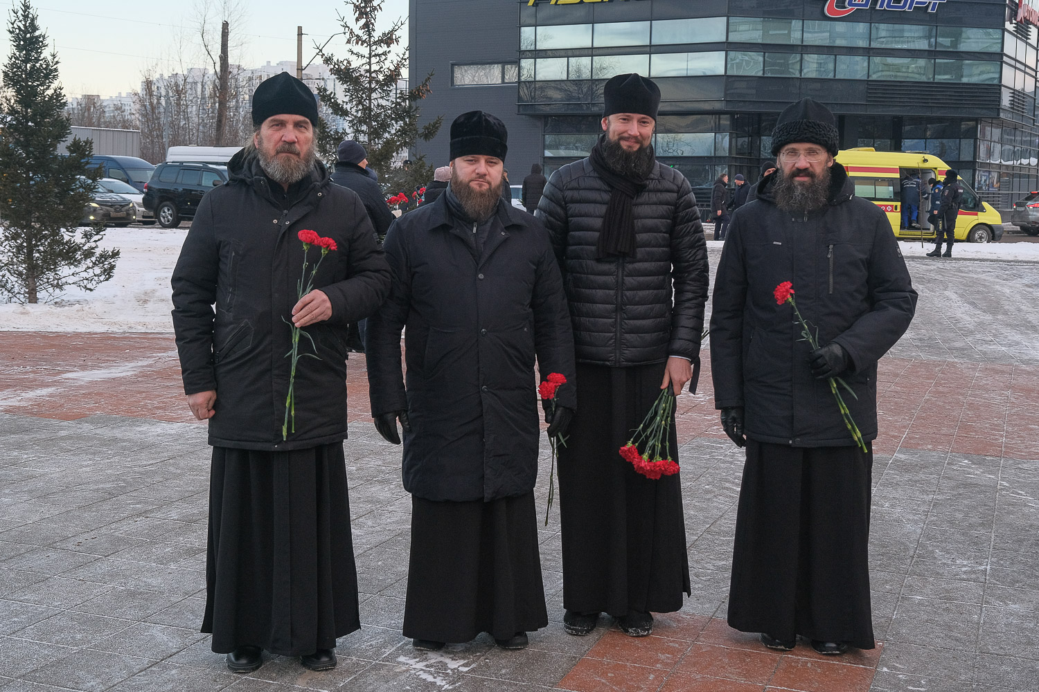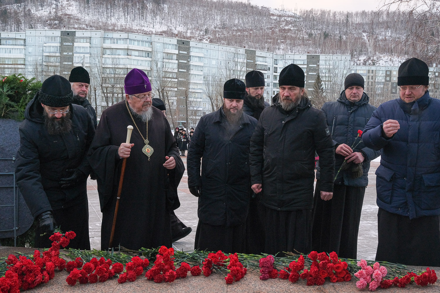 Митрополит Красноярский и Ачинский Пантелеимон, епископ Норильский и Туруханский Агафангел, епископ Енисейский и Лесосибирский Игнатий, епископ Минусинский и Курагинский Серафим, епископ Канский и Богучанский Вячеслав возложили цветы к памятнику, и вместе с собравшимися почтили память героев минутой молчания.