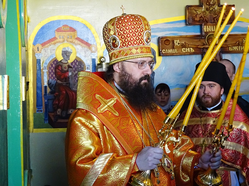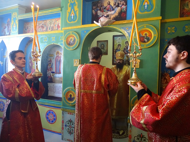 На богослужении Его Преосвященству сослужили: иеромонах Герман(Мельников) - секретарь Норильской и Туруханской епархии; протоиерей Димитрий Харцыз – председатель епархиального отдела по вопросам взаимодействия с Вооруженными Силами и Силовыми Структурами Российской Федерации, настоятель храма.