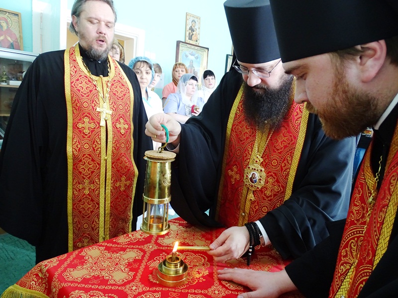 Епископ с братией привезли частицу Благодатного Огня и зажгли все светильники, после чего отслужили краткий молебен.