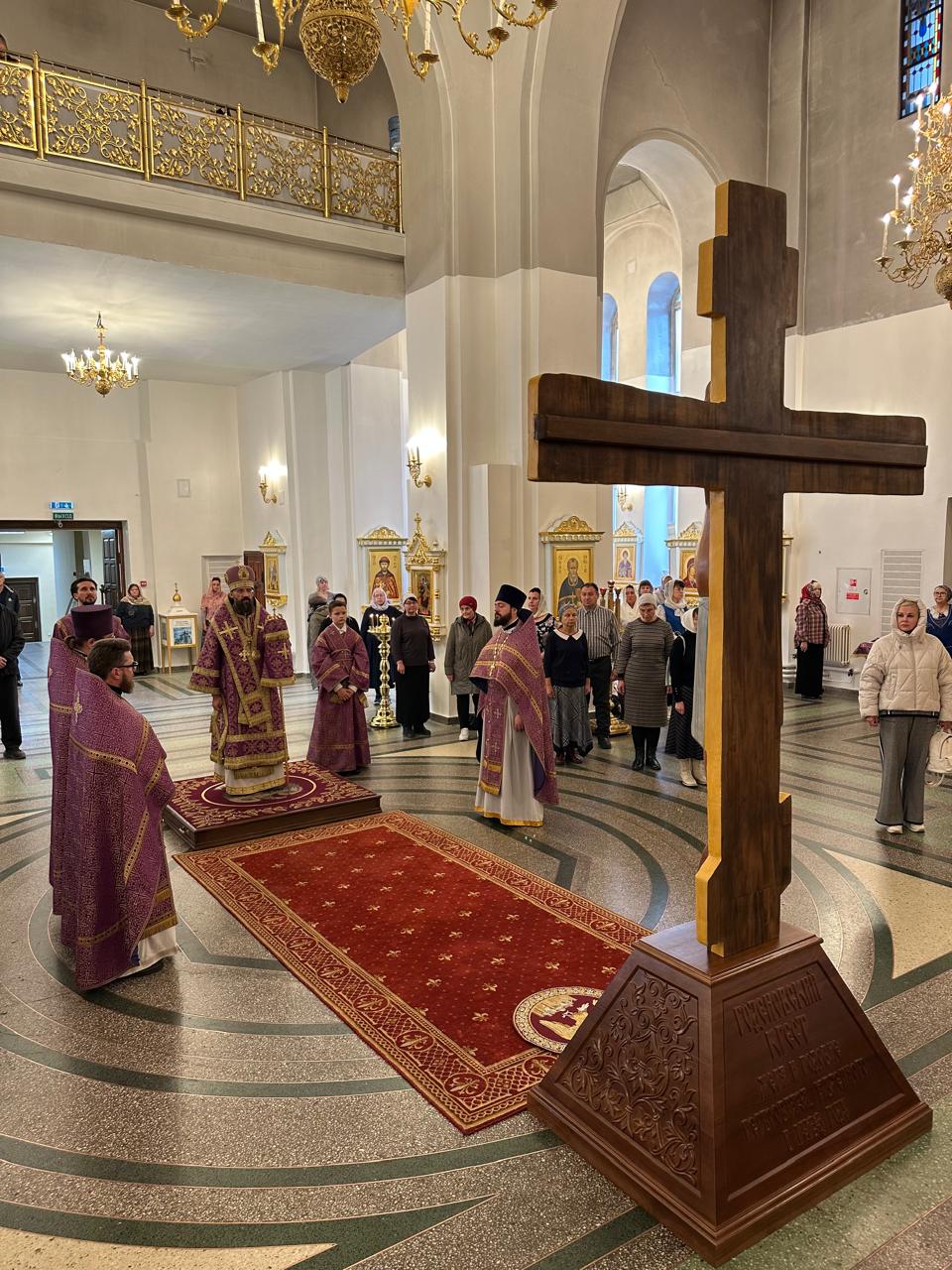 По окончании Литургии Архипастырь и духовенство совершили славление и поклонились Кресту Господню.