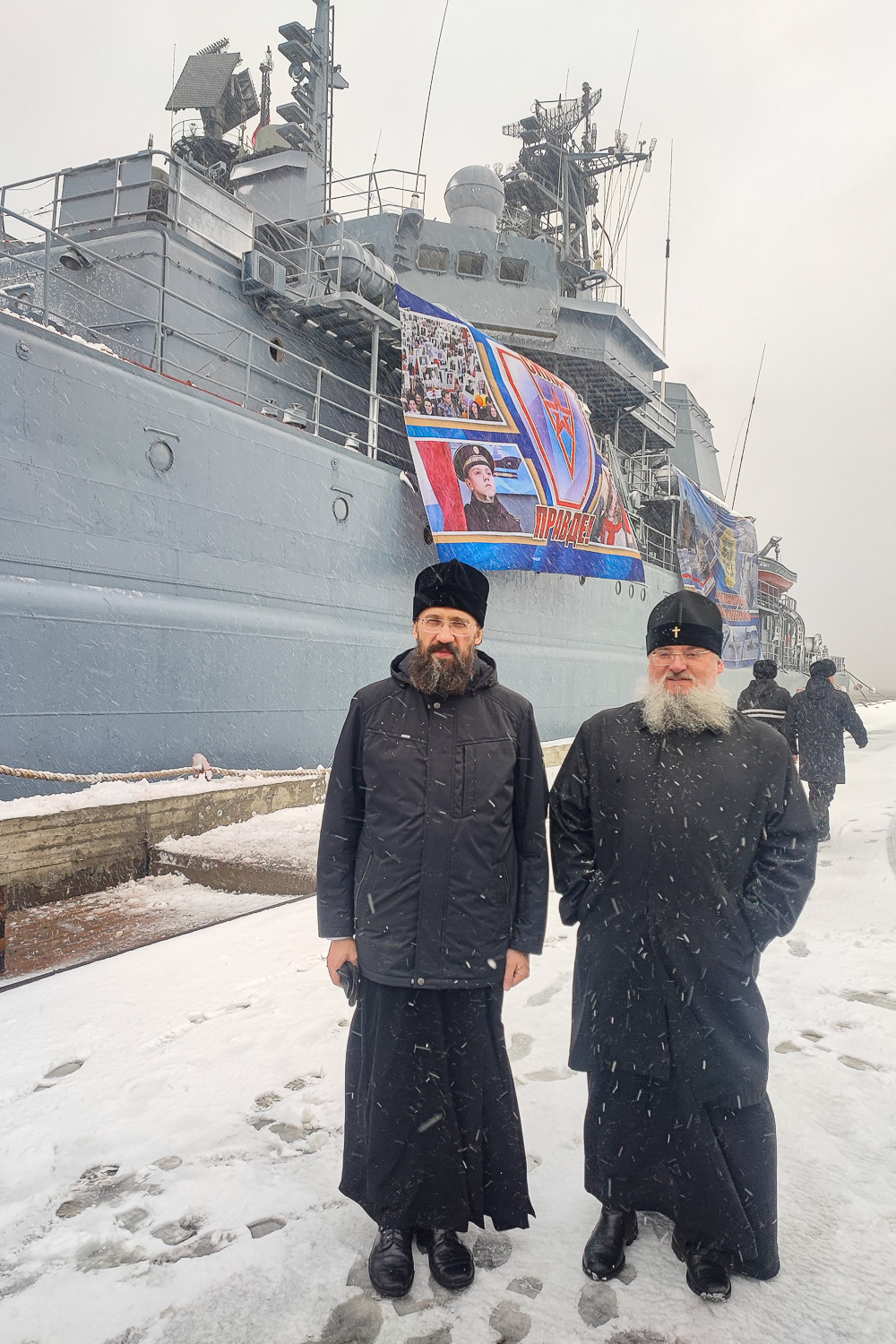 Затем архиереи Красноярской митрополии посетили боевые корабли Северного флота: большой противолодочный корабль «Североморск» и большой десантный корабль «Александр Отраковский». Отряд боевых кораблей Северного флота прибыл в порт Дудинка из порта Диксон по реке Енисей. Ранее отряд выполнял задачи в Баренцевом, Норвежском и Карском морях. Во время пребывания кораблей в порту Дудинки проводятся патриотические мероприятия в память о 80-й годовщине Победы в Великой Отечественной войне. Архиереи посетили выставку в рамках акции «Сила в правде», которая организована на корабле «Александр Отраковский».