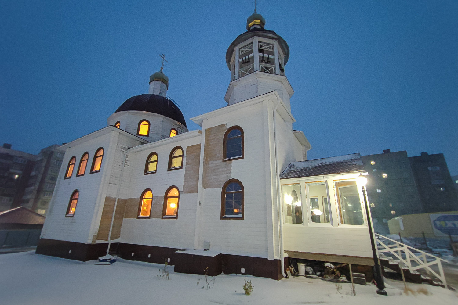 В завершение рабочего дня архиереи Красноярской митрополии посетили храм Преображения Господня в районе Кайеркан города Норильска.