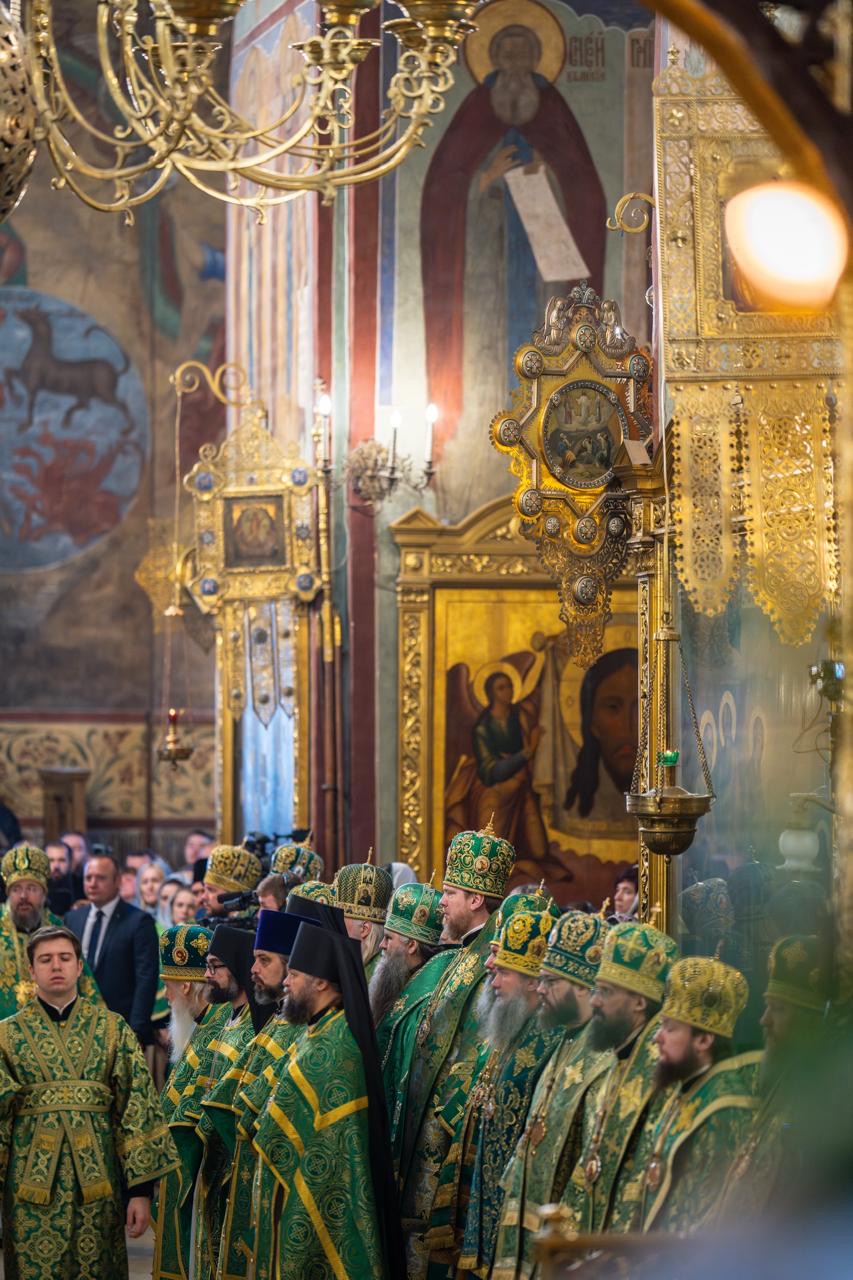 В соборе молились архиереи, настоятельницы женских монастырей, священнослужители, монашествующие и паломники, прибывшие на торжества в Троице-Сергиеву лавру.