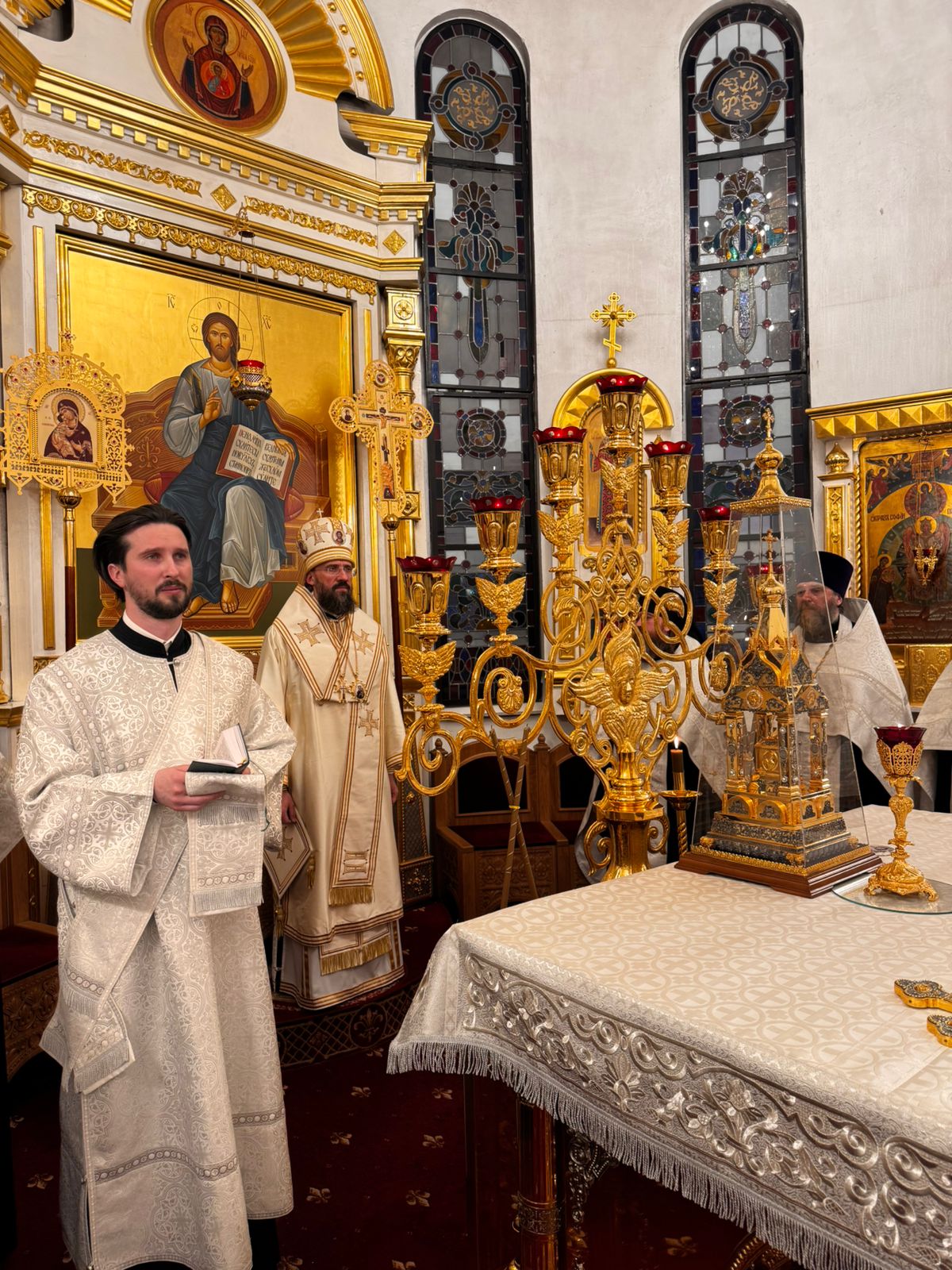По традиции перед началом богослужения на аналое в центре храма была установлена икона Божией Матери «Страшное Предстательство». Образ является главной святыней монастыря Кутлумуш на Святой горе Афон. Список с древней чудотворной иконы был написан братией афонского скита праведной Анны и передан в дар жителям города Норильска. В течение года икона хранится в алтаре кафедрального собора и выносится для поклонения верующим только дважды в год: на великую вечерню в день праздника Рождества Христова и на богослужение Великого поста в день праздника Похвалы Божией Матери (Субботы Акафиста).