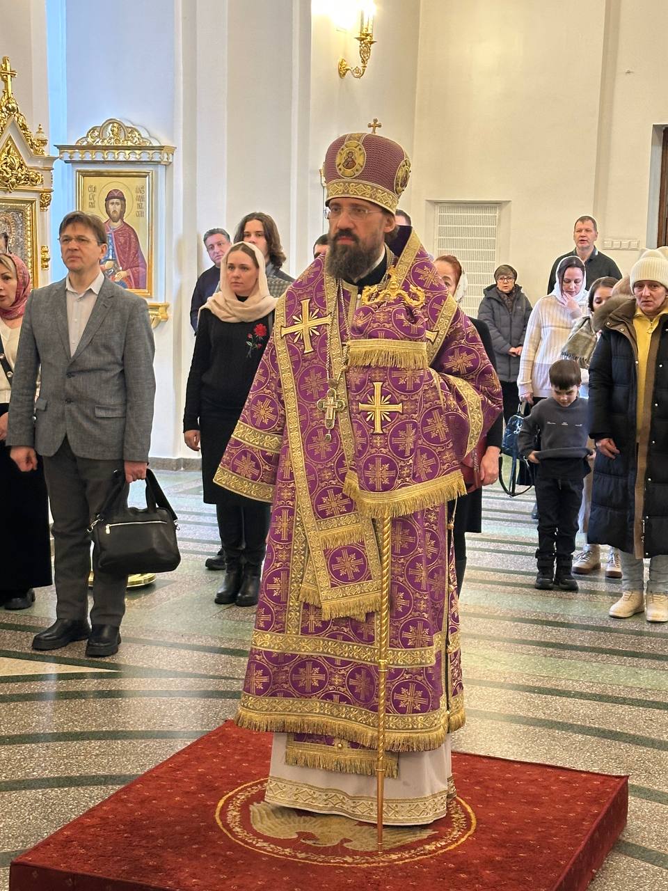 15 марта 2026 года, в Неделю 3-ю Великого поста, Крестопоклонную, праздник иконы Божией Матери, именуемой «Державная», Преосвященнейший Агафангел, епископ Норильский и Туруханский, совершил Божественную литургию святителя Василия Великого в кафедральном соборе иконы Божией Матери «Всех скорбящих Радость» города Норильска.