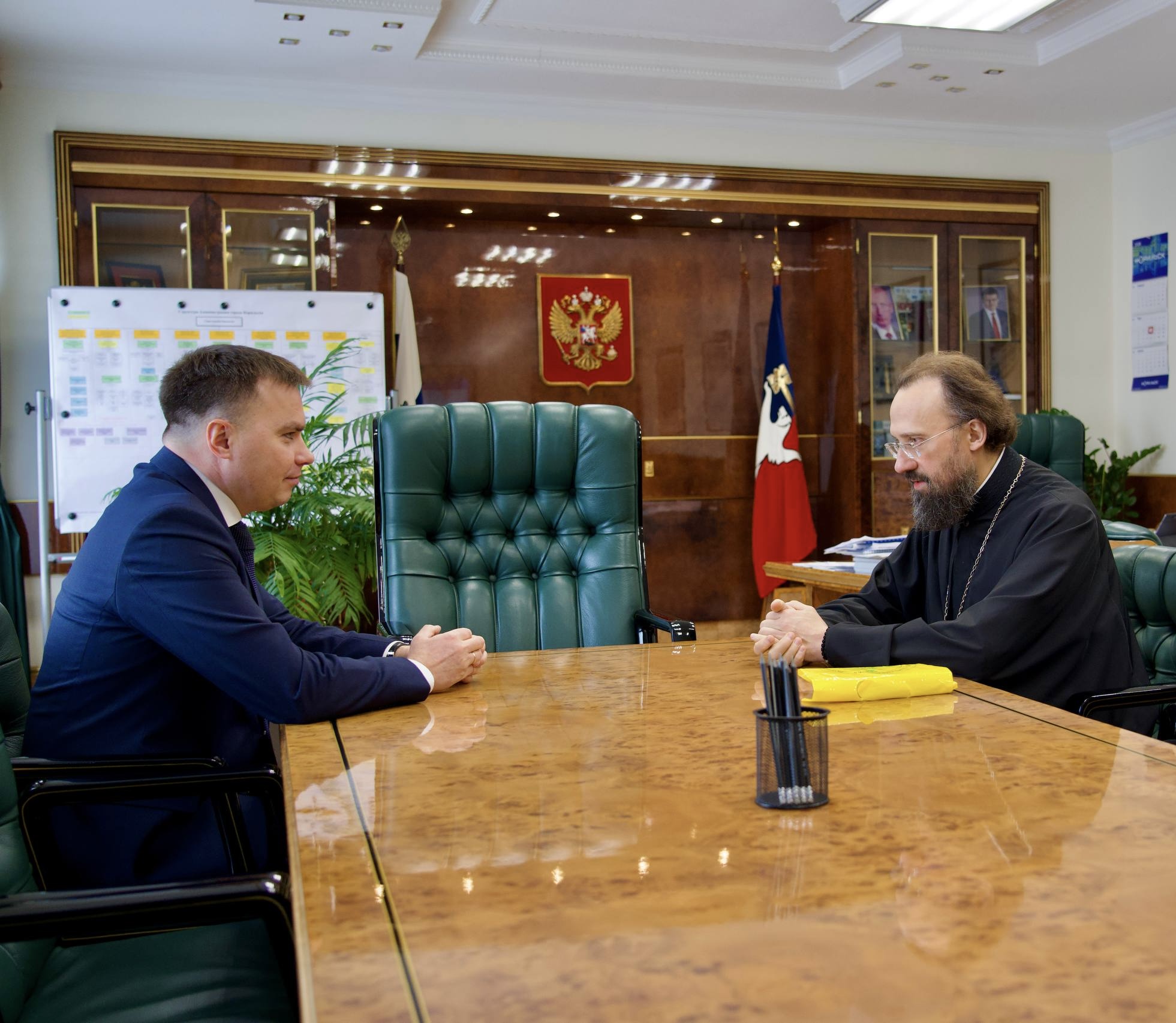 Перед началом встречи епископ Агафангел поздравил Дмитрия Карасева с избранием на должность Главы города Норильска в этом году.
