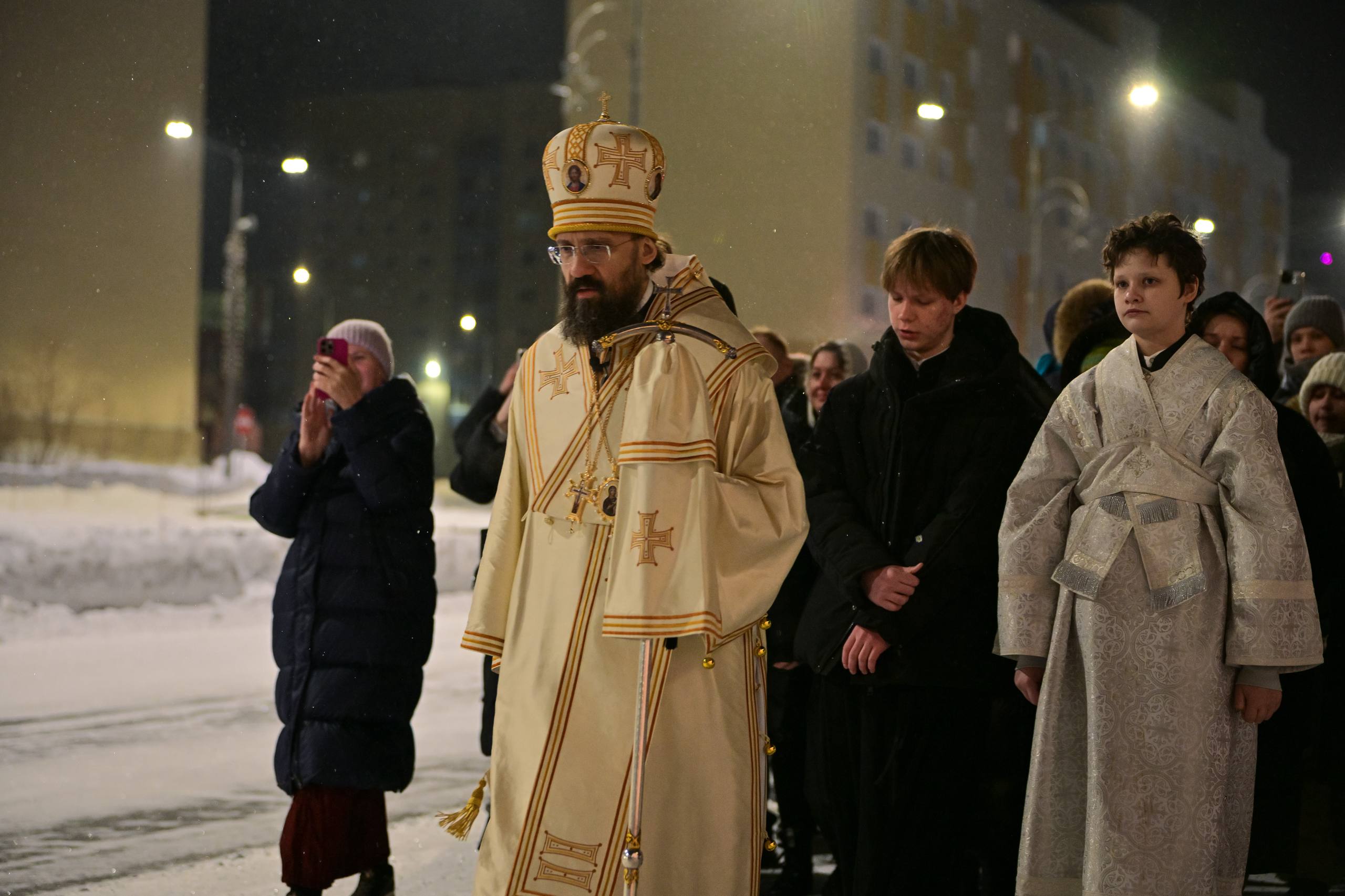 В ночь с 11 на 12 апреля 2026 года в кафедральном соборе иконы Божией Матери «Всех скорбящих Радость» города Норильска Преосвященнейший Агафангел, епископ Норильский и Туруханский, совершил Пасхальные богослужения — полунощницу, крестный ход, Пасхальную заутреню и Божественную литургию святителя Иоанна Златоуста.
