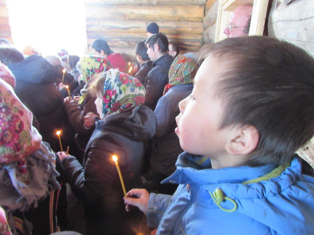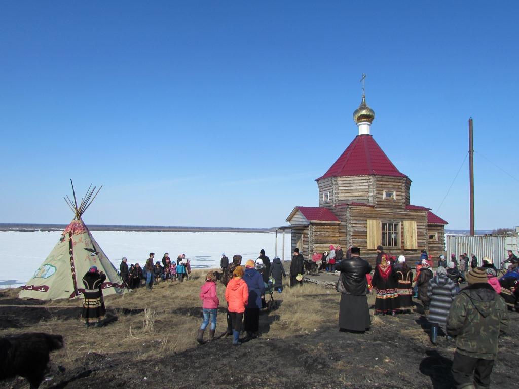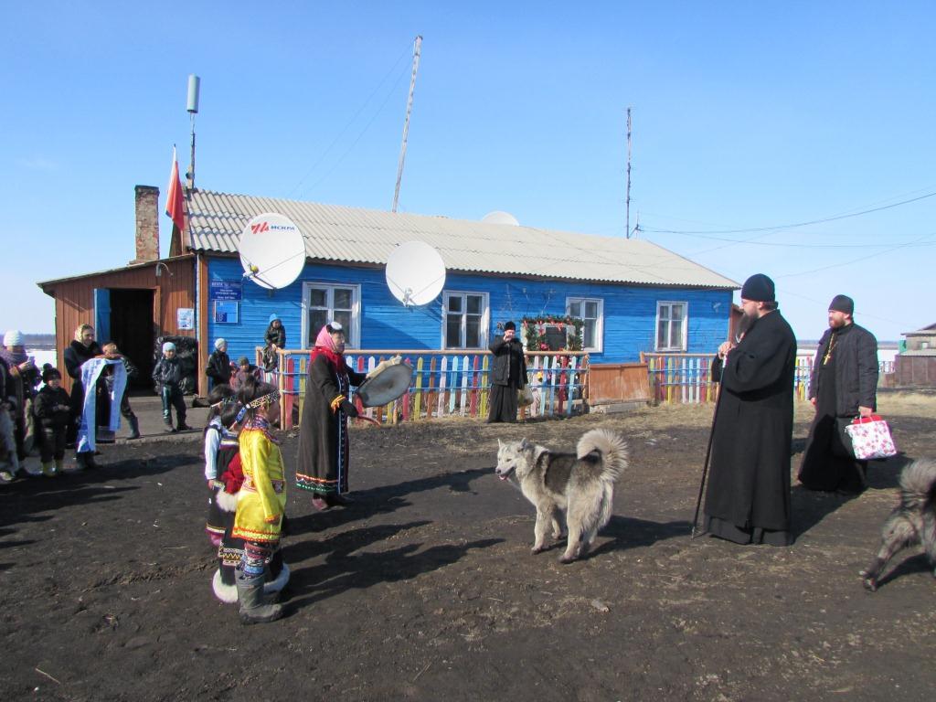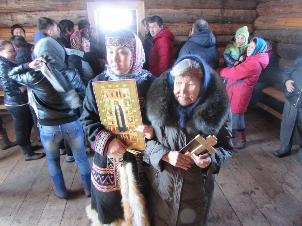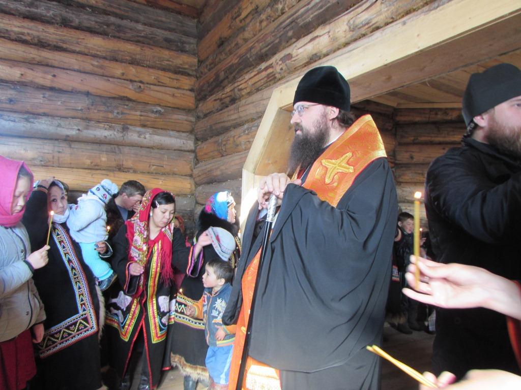 Встречали гостей всем поселком, долганским национальным хлебом, народными песнями и добрыми пожеланиями на русском и долганском языках. У вертолета Владыку Агафангела и делегацию Норильской епархии приветствовали глава администрации поселка Августа Павловна Чуприна и старейший житель Хеты Ольга Павловна Жилкина. От вертолетной площадки все двинулись к храму. Красивый, собранный из больших бревен, он сверкает крестом и золотым куполом и виден еще при подлете к Хете. Когда вслед за Владыкой все вошли в храм, то заполнили его целиком и даже стояли на пороге. Жители Хеты любят свой храм, гордятся им, и не беда, что пока внутренне убранство не завершено. Храм окормляет настоятель Богоявленского храма в Хатанге иеромонах Евфимий (Гончаров). Стараниями отца Евфимия построен этот храм и его попечением здесь зарождается молодой и дружный приход.