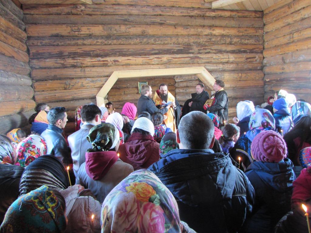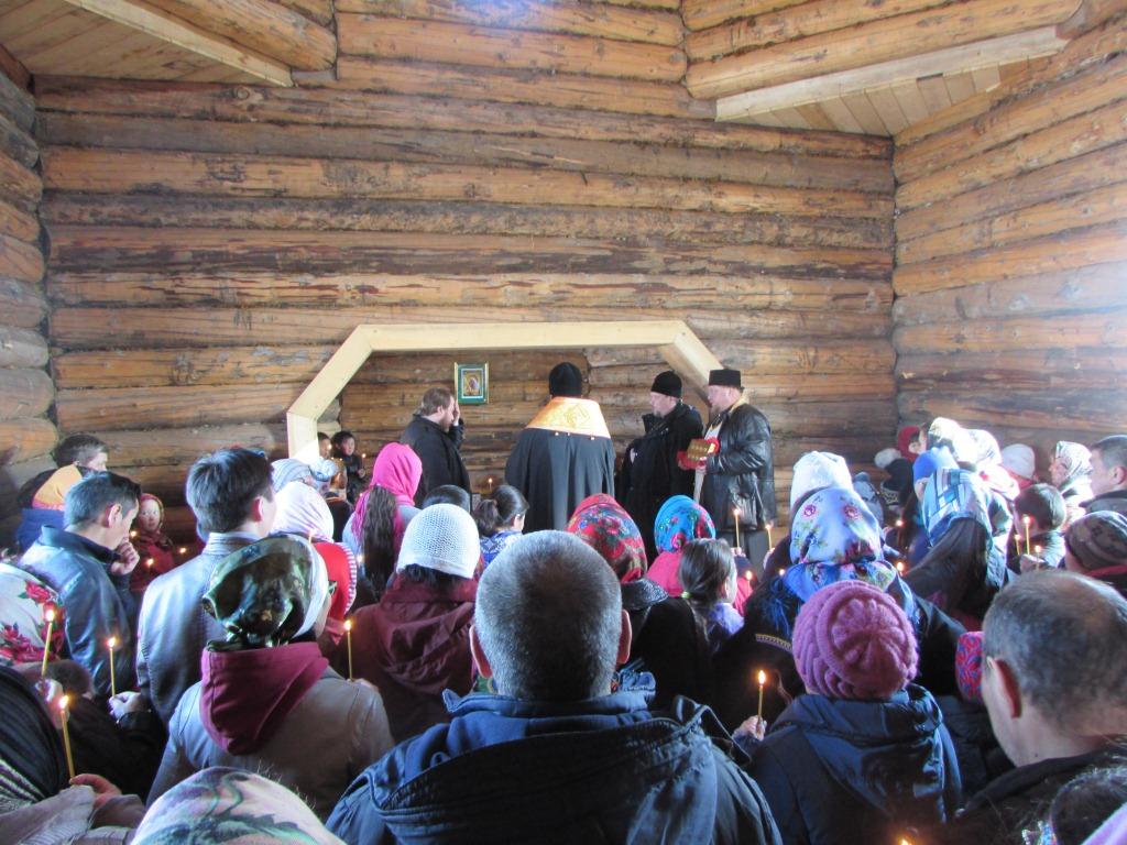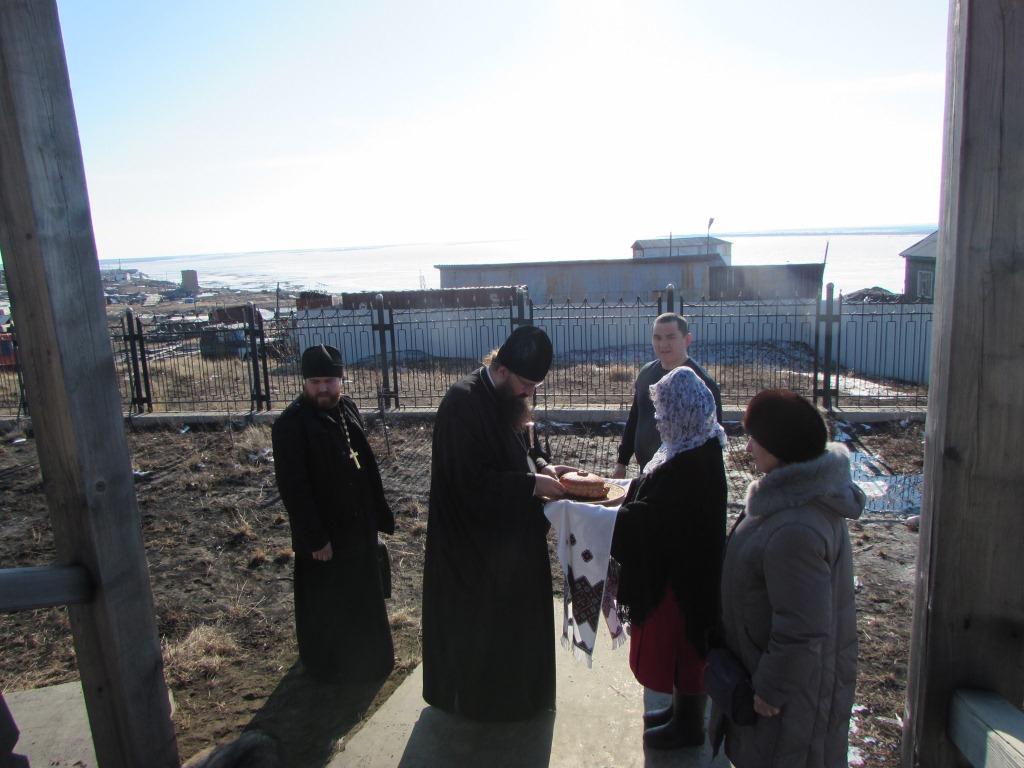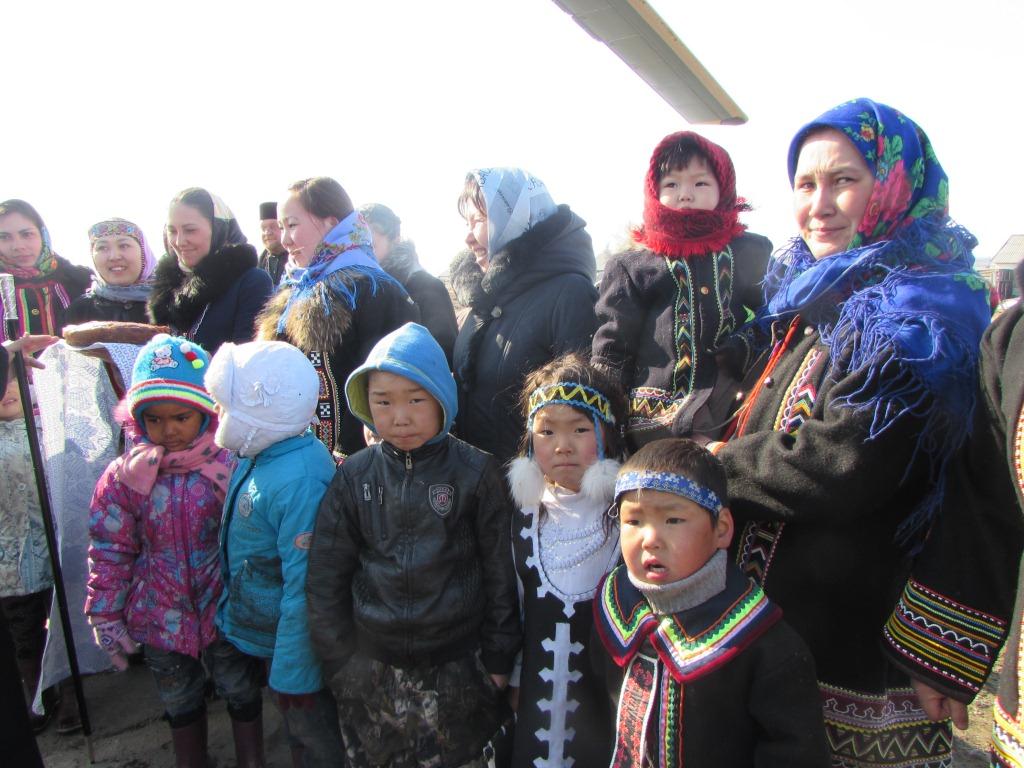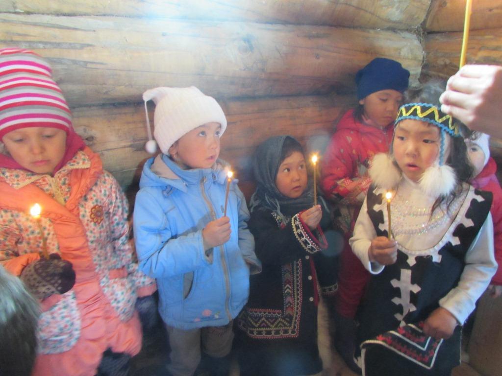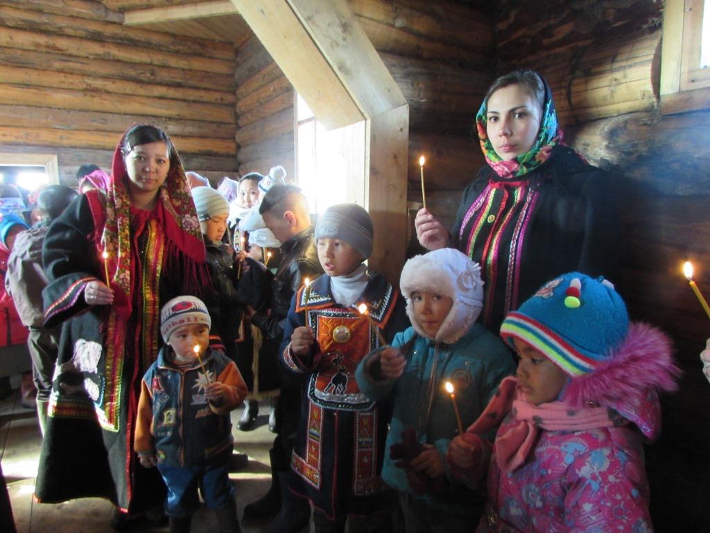 Встречали гостей всем поселком, долганским национальным хлебом, народными песнями и добрыми пожеланиями на русском и долганском языках. У вертолета Владыку Агафангела и делегацию Норильской епархии приветствовали глава администрации поселка Августа Павловна Чуприна и старейший житель Хеты Ольга Павловна Жилкина. От вертолетной площадки все двинулись к храму. Красивый, собранный из больших бревен, он сверкает крестом и золотым куполом и виден еще при подлете к Хете. Когда вслед за Владыкой все вошли в храм, то заполнили его целиком и даже стояли на пороге. Жители Хеты любят свой храм, гордятся им, и не беда, что пока внутренне убранство не завершено. Храм окормляет настоятель Богоявленского храма в Хатанге иеромонах Евфимий (Гончаров). Стараниями отца Евфимия построен этот храм и его попечением здесь зарождается молодой и дружный приход.