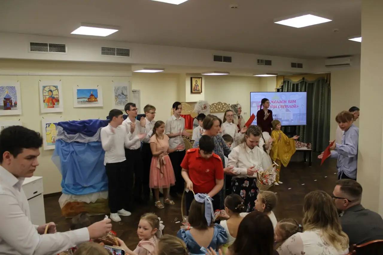 Воспитанники воскресной школы, родители и прихожане-участники «Воскресной беседки» исполнили песни и стихи, посвященные празднику Воскресения Христова и представили театральную зарисовку «Сказка о рыбаке и рыбке».