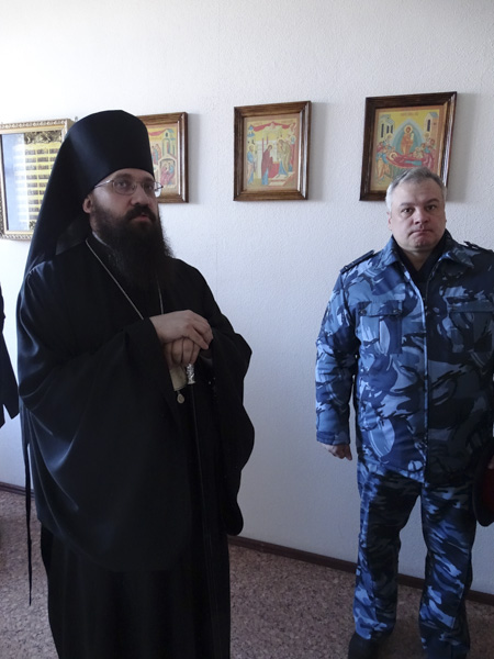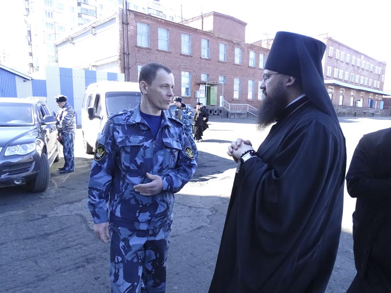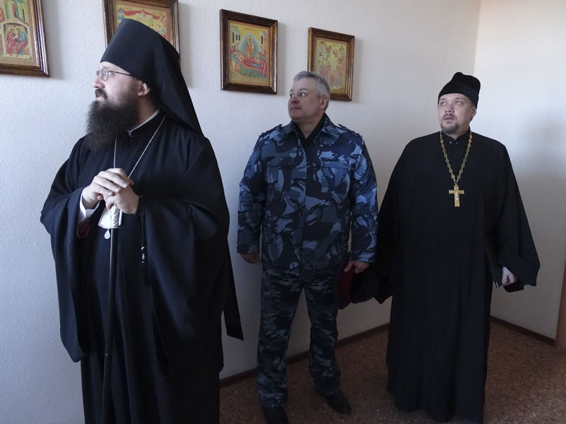 Его Преосвященству сослужили: секретарь Норильской епархии иеромонах Герман (Мельников) и председатель епархиального отдела по тюремному служению протоиерей Димитрий Харцыз.