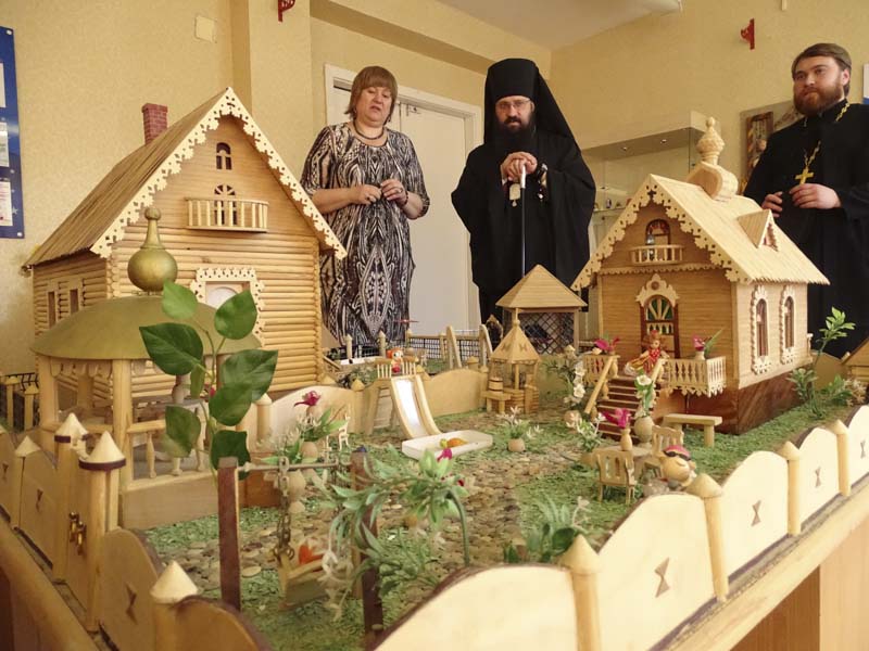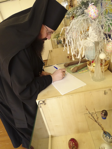 В рамках визита, Владыка посетил экскурсию по школьному музею, которая посвящена Светлому Христову Воскресению. Были представлены различные виды пасхальных яиц, макеты деревянных изб и храмов, а так же предметы деревенского быта.