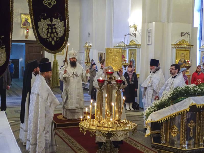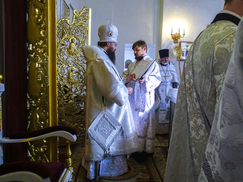 Его Преосвященству сослужили: секретарь епархии иеромонах Герман (Мельников), благочинный Норильского округа протоиерей Владимир Иванов и духовенство кафедрального собора.