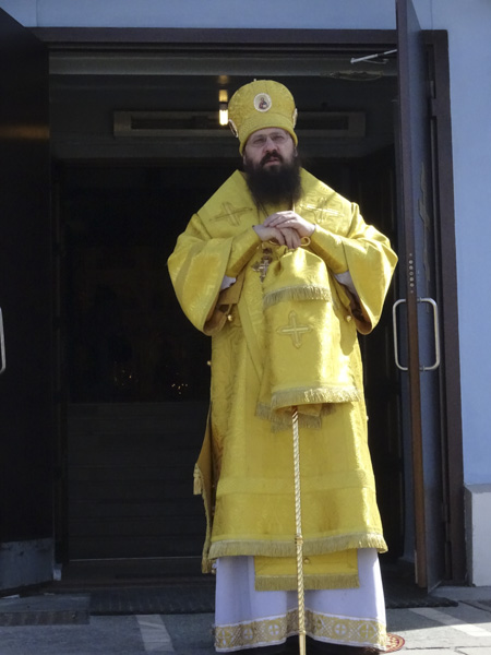 По окончании богослужения Владыка обратился к верующим со словами проповеди со ступеней храма.