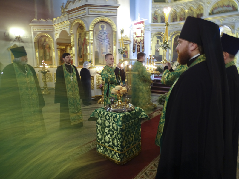 На богослужении были освящены хлеб, вино, пшеница и елей