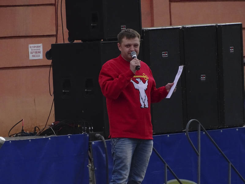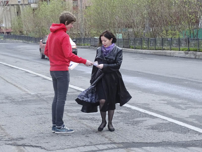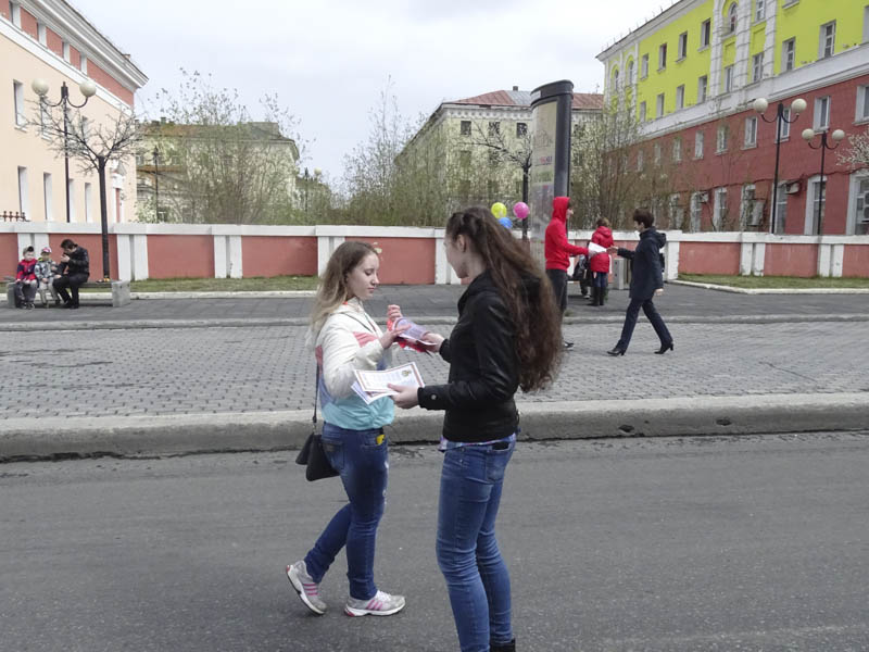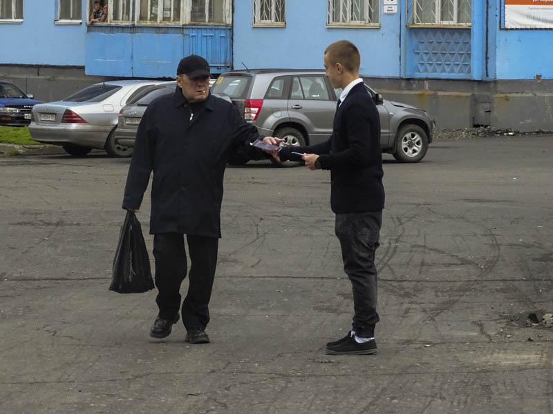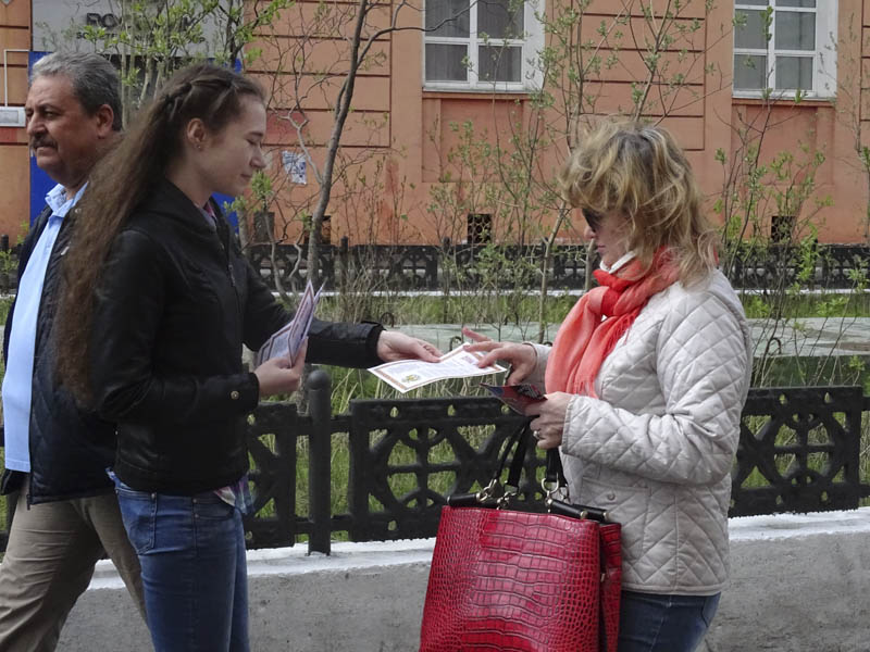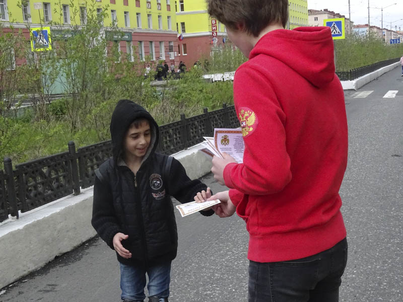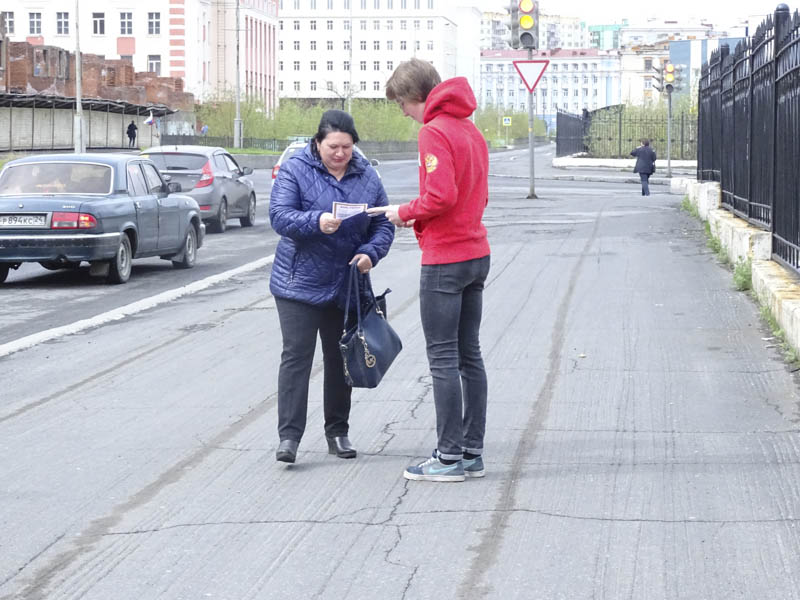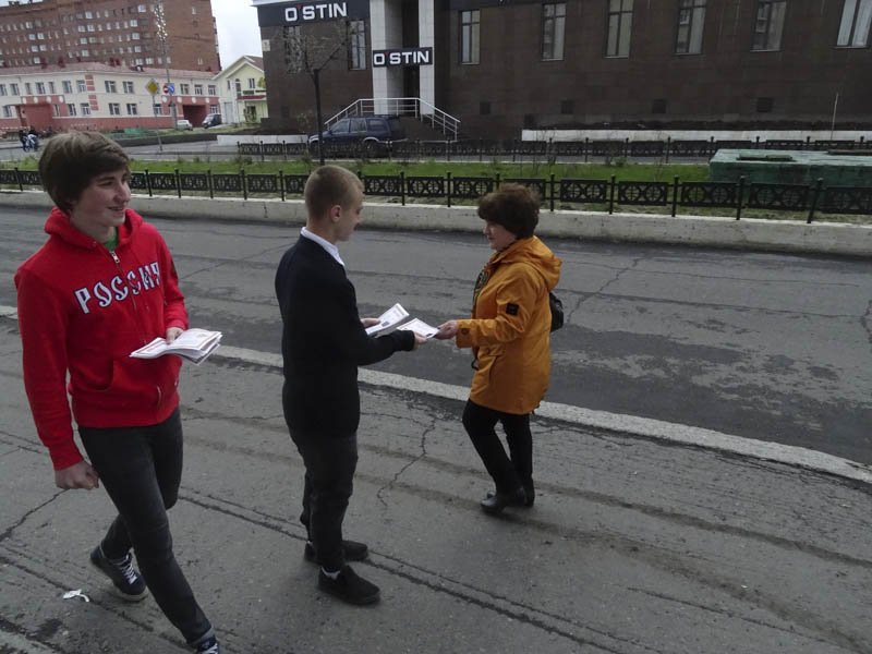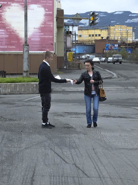 В первой половине дня раздача велась у ворот кафедрального собора города Норильска, а потом компания православных молодых людей отправилась по главной улице города.