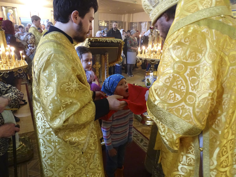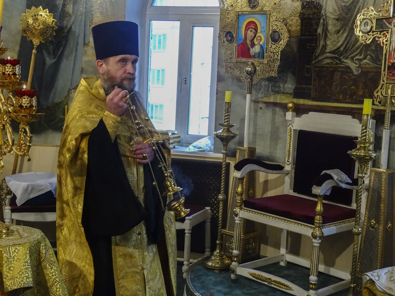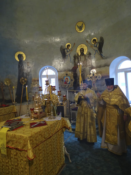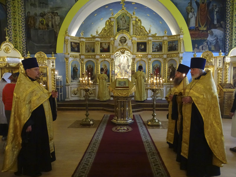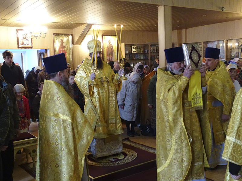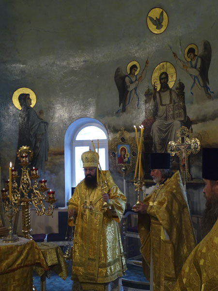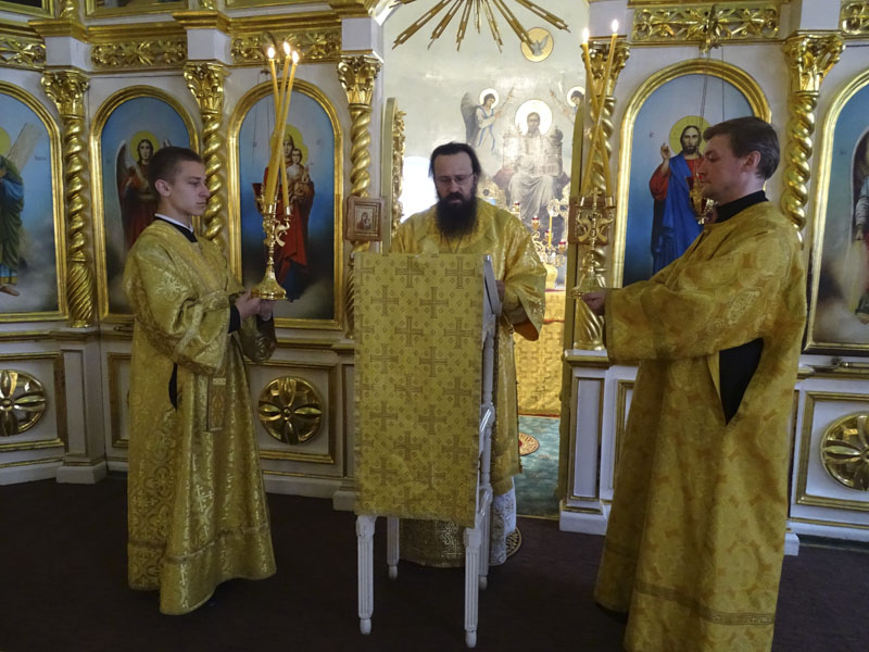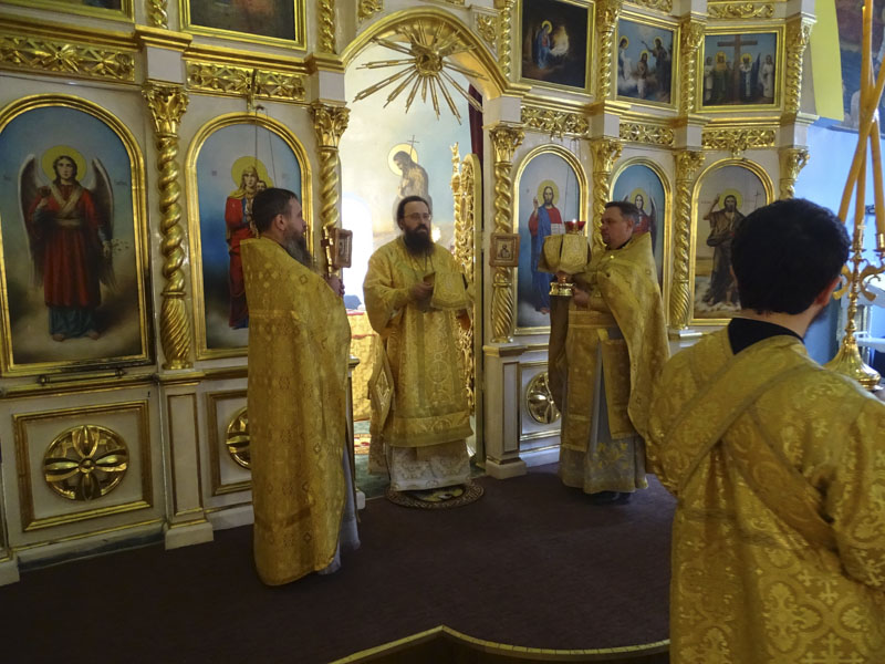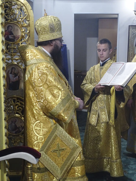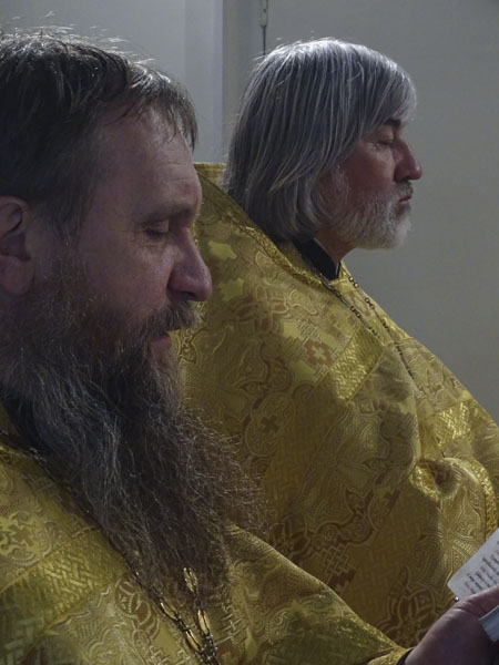 Его Преосвященству сослужили: благочинный Норильского округа протоиерей Владимир Иванов; руководитель епархиального отдела по взаимодействию с силовыми структурами протоиерей Димитрий Харцыз; штатный клир собора.