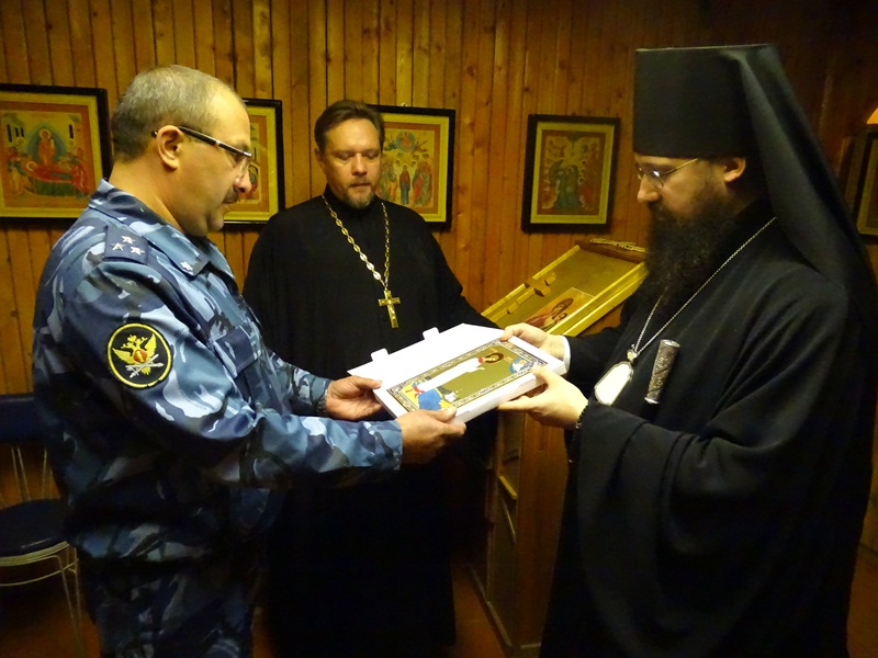 От лица Правящего Архиерея , для храма учреждения, в дар, была передана икона небесного покровителя Норильской епархии св. муч. Василия Мангазейского, которую с благодарностью принял начальник СИЗО, полковник внутренней службы Шульга Олег Федорович. По окончании состоялось короткое совещание, на котором были затронуты вопросы взаимодействия в сфере духовного окормления осужденных, лиц, находящийся под стражей и сотрудников ФСИН.