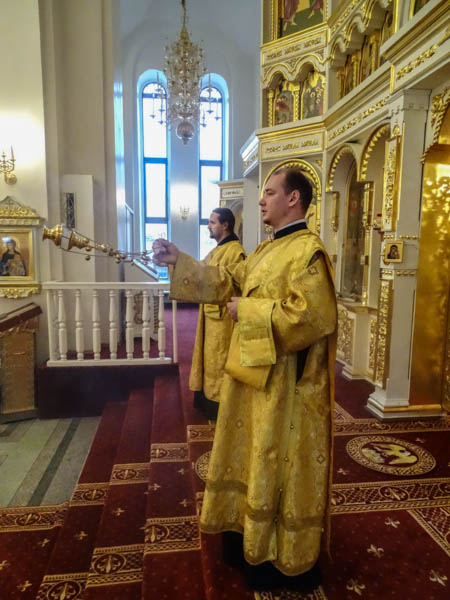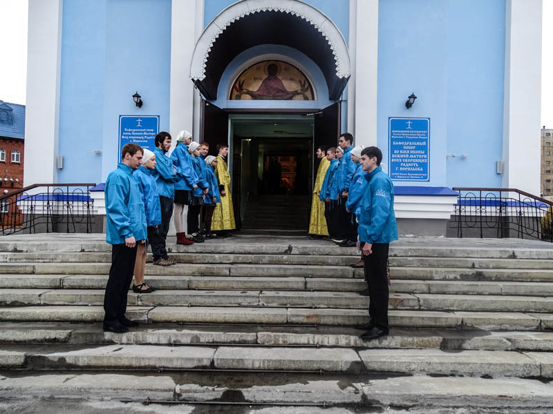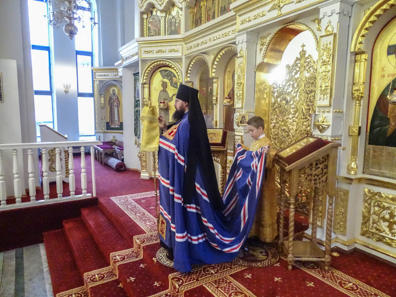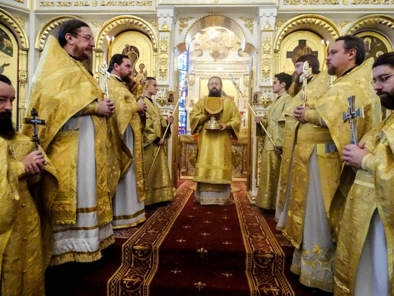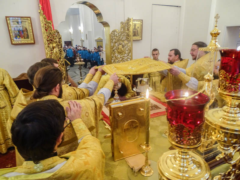 Его Преосвященству сослужили: секретарь Норильской епархии иеромонах Герман (Мельников) и духовенство кафедрального собора города Норильска. На Богослужении присутсвовали участники волонтерского движения Норильской епархии.