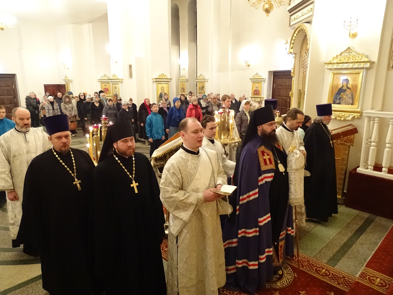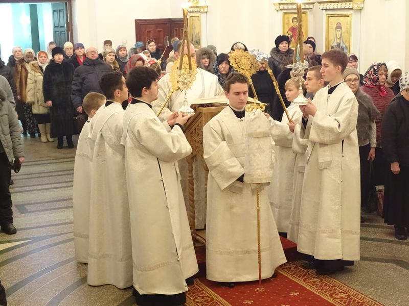 Его Преосвященству сослужили: секретарь Норильской епархии иеромонах Герман (Мельников), благочинный Норильского округа и ключарь кафедрального собора протоиерей Владимир Иванов, председатель епархиального отдела по взаимодействию с вооруженными силами протоиерей Димитрий Харцыз, клирики кафедрального собора.