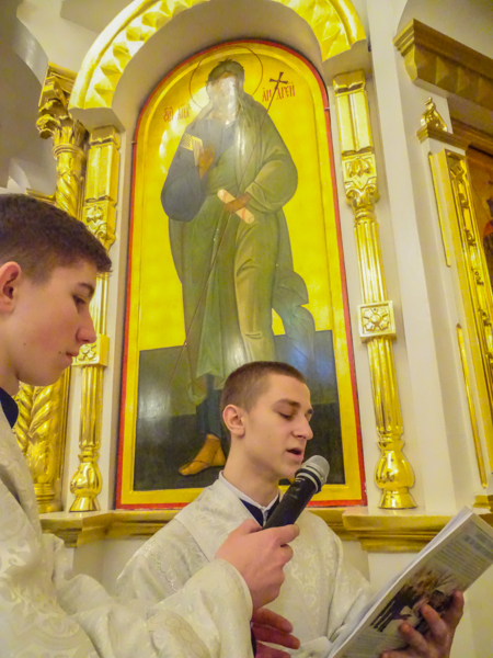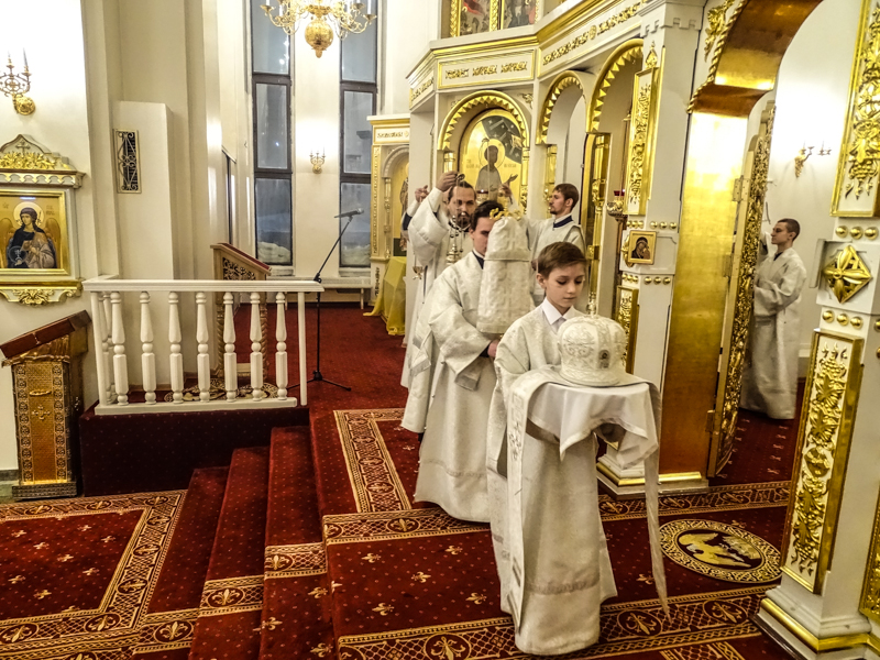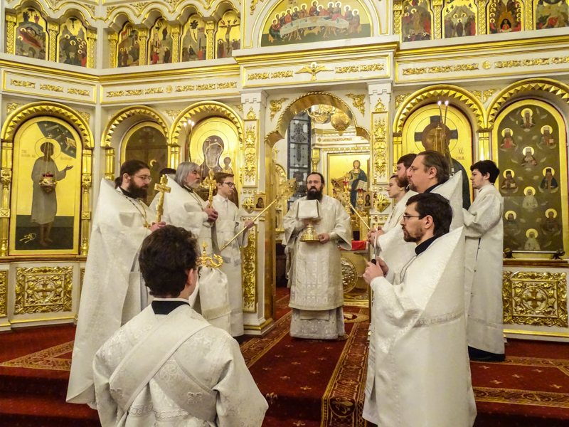 Его Преосвященству сослужили: секретарь Норильской епархии иеромонах Герман (Мельников); благочинный Норильского округа и ключарь Кафедрального собора протоиерей Владимир Иванов; председатель епархиального отдела по вопросам взаимодействия с Вооруженными Силами протоиерей Димитрий Харцыз; штатные клирики кафедрального собора.