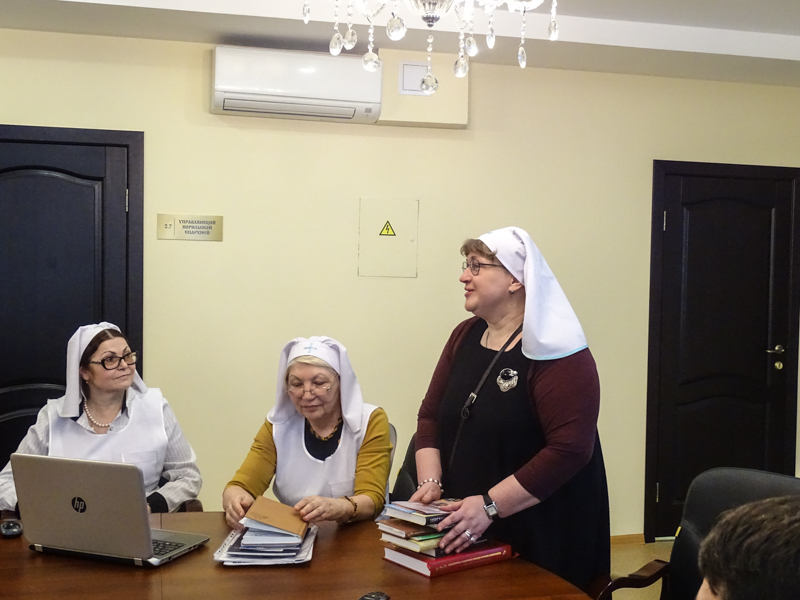 Старшей сестрой сестричеста Ласточкиной Татьяной Владимировной было представлено несколько презентаций, в которых рассказывалось об опыте крупных сестричеств, несущих свое служение в центральной России и на Украине. С этим опытом Татьяна Владимировна смогла познакомиться в рамках работы секции социального служения Рождественских общеобразовательных чтений, проходивших в Москве.